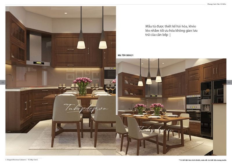 Sự khéo léo của các kiến trúc sư được thể hiện trong từng chi tiết thiết kế phòng bếp - ăn hiện đại từ gỗ óc chó. Vẫn có các chi tiết nhấn nhá nhưng là các đường nét vuông vắn gọn gàng nhất.