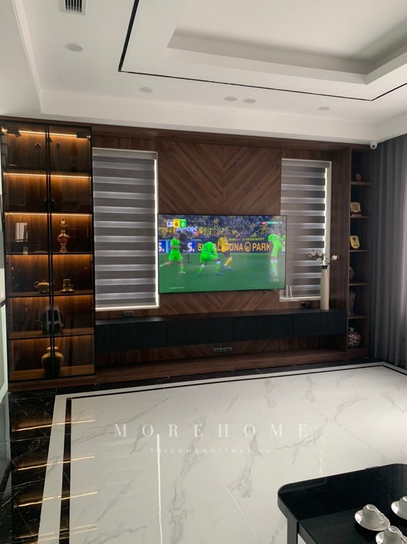 Mẫu kệ tivi gỗ óc chó tân cổ điển đã được thêm vào công trình nội thất biệt thự đẹp tại Hưng Yên Ecopark, tạo nên một không gian sang trọng cho phòng khách.