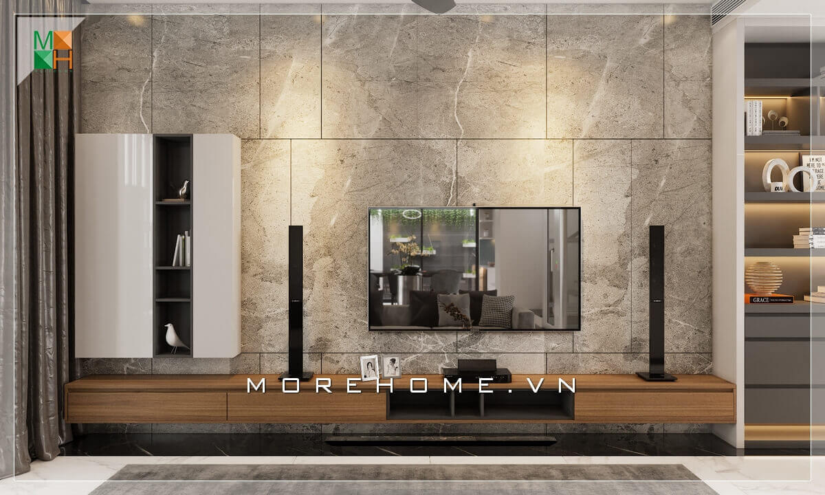 Kệ tivi gỗ thiết kế sáng tạo dài và hiện đại phù hợp với diện tích căn phòng.